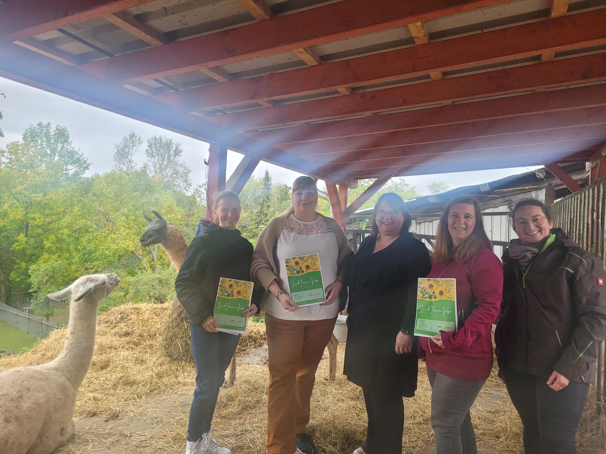 Wer hat wen gewählt? Jede von uns Frauen wurde mit einem besonderen Charakter von Lama konfrontiert und herausgefordert, nur mit Konzentration auf das Tier, auf das hier und jetzt, kann man ein Lama gut führen. Genau das ist der Punkt: im Hier und Jetzt sein, sich auf die aktuelle Situation konzentrieren und mit Leidenschaft dabei sein – genau wie die LandFrauenarbeit. Klar ist es nicht immer einfach, ein Lama schert aus der Gruppe aus, das andere will gerade fressen, das andere sich wälzen und eines ein Gruppenmitglied provozieren und stänkern. Das sind die Situationen denen wir im täglichen Leben, im Beruf, der Familie oder dem Vereinsleben, begegnen und die wir Frauen souverän meistern müssen. Sich auf die aktuelle Situation – ob Lama oder Mensch – einlassen und ruhig bleiben, das hilft meistens schon etwas weiter.
